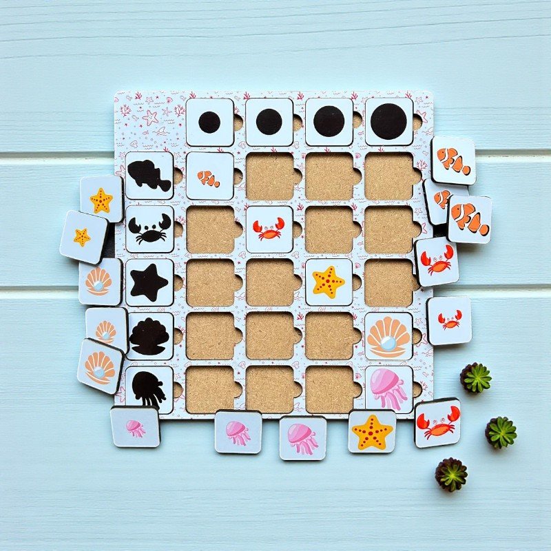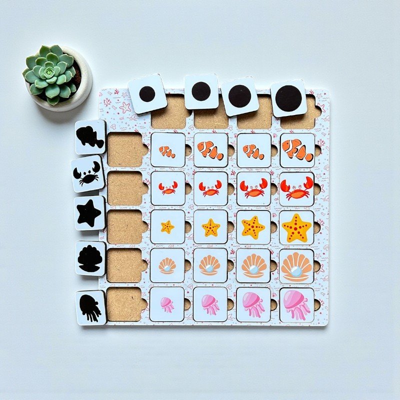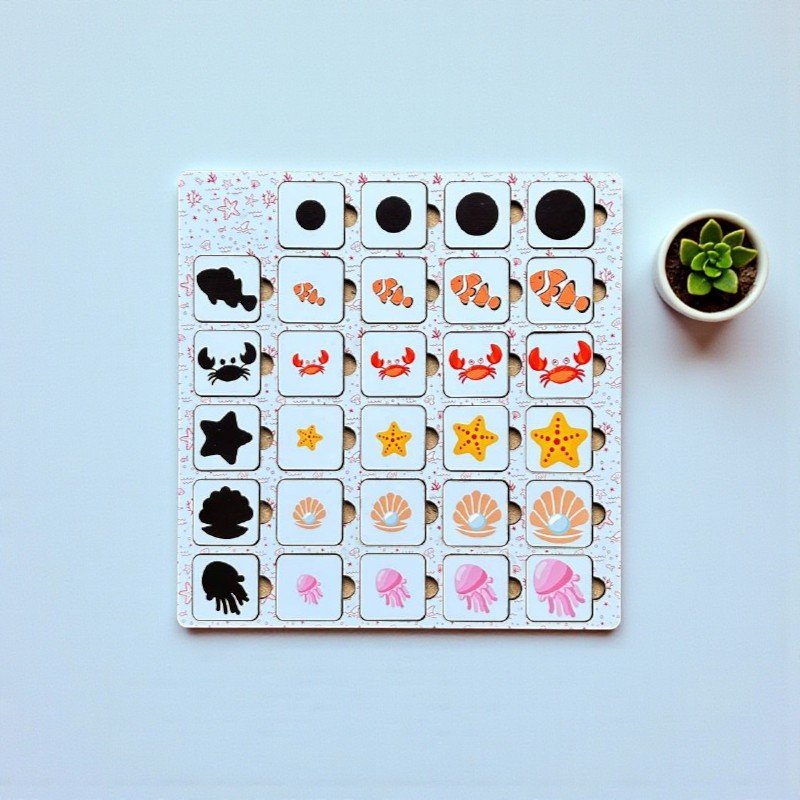 Children observe each animal tile and find its matching shadow on the board. This activity encourages careful observation, comparison of shapes, and logical thinking before placing each piece correctly.