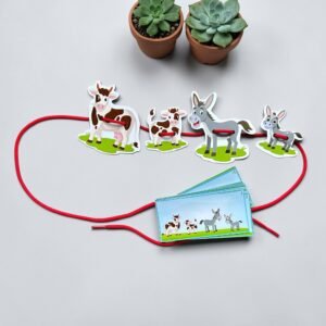This activity helps children build early knowledge of animal families while developing fine motor skills, hand–eye coordination, and concentration through the lacing process.