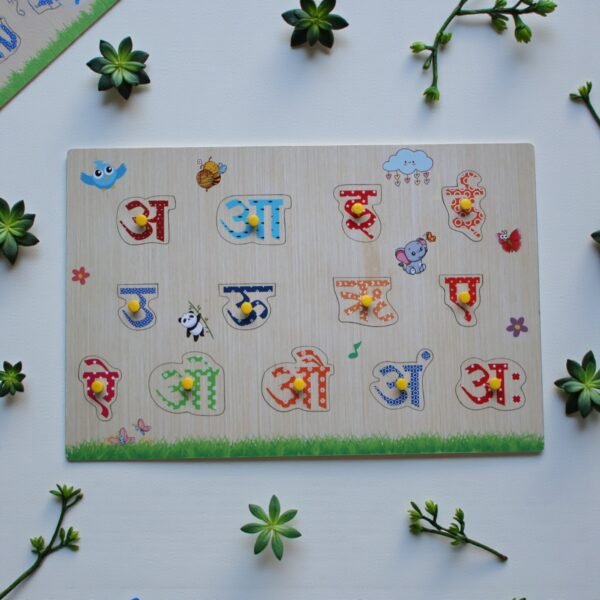 Introduce your child to Marathi Swar (Vowels) with this beautifully crafted, interactive wooden knob puzzle. Each vowel piece comes with a bright illustration and an easy-grip knob, making it perfect for little hands to lift, match, and learn.