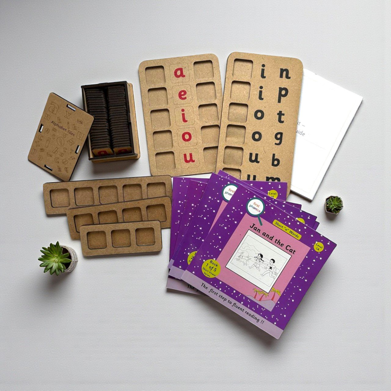 This combo includes a phonics activity kit with durable wooden boards and letter tiles, along with a set of 7 leveled phonics readers that guide children step by step toward fluent reading.