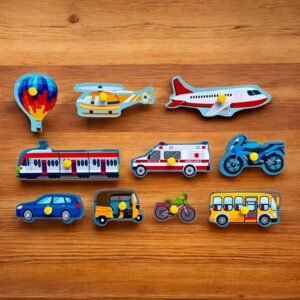 🚗🚁 Overview: The Transport Peg Puzzle whisks children away on an exciting journey through different modes of transport. With 10 wooden peg pieces, each depicting a unique vehicle such as an air balloon, helicopter, aeroplane, train, bicycle, ambulance,cycle, car, bus, and auto, this puzzle is a vibrant exploration of movement and travel.